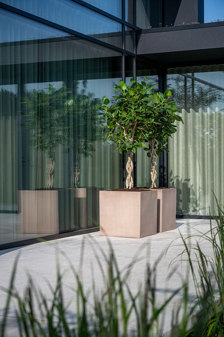 Кашпо сделано из файберстоуна. Это инновационный материал, в чей состав входят преимущественно натуральные компоненты: песок, каменная крошка, измельченное стекло, смолы. Изделия из файберстоуна устойчивы к механическим нагрузкам и атмосферному воздействию. Поэтому куб Block можно использовать для высадки растений как внутри, так и снаружи помещения.