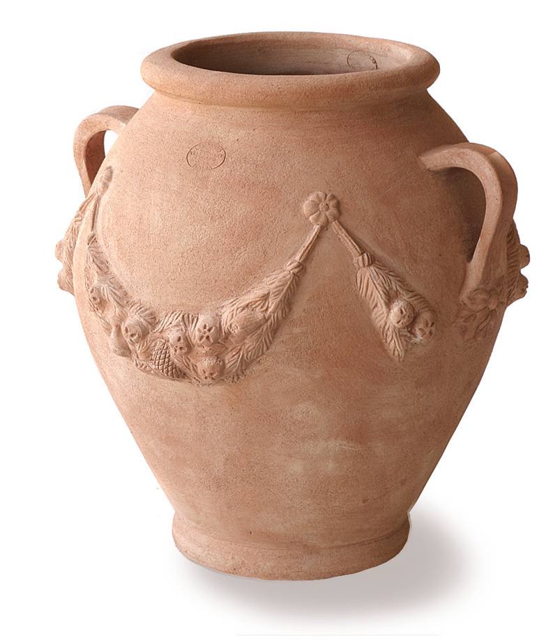 Глиняный кувшин Фестоне украшен объёмными гирляндами. Классическая форма, ручки по бокам и античный декор делают его замечательным украшением дома, ресторана или террасы. Такой кувшин с деревом или цветами напомнит вам о летнем путешествии в Италию или Грецию.