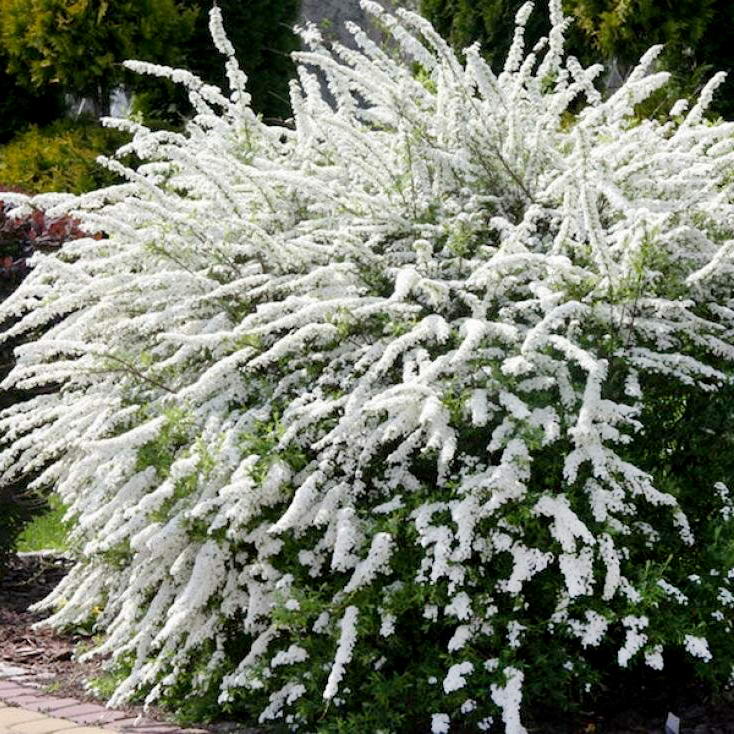 Неприхотливый кустарник среднего размера идеальна для одиночных посадок. В групповых посадках спирея образует пышное цветущее облако благодаря поникающим побегам, обильно усыпанными белыми соцветиями