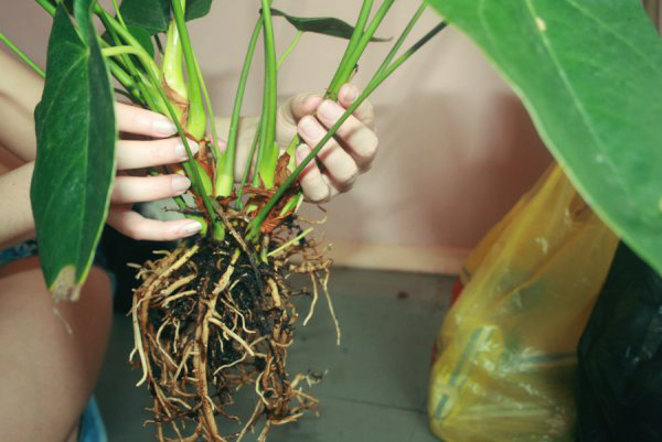 Перед пересадкой хорошо полейте антуриум. После этого аккуратно извлеките растение из горшка. Стряхните лишнюю землю с корней, слегка постукивая по ним. Внимательно осмотрите корни растения – если среди них есть загнившие или отмершие, удалите их. После процедуры удаления обработайте корни антисептиком. Помимо гнилых корней стоит также удалить пожелтевшие и завявшие листья.