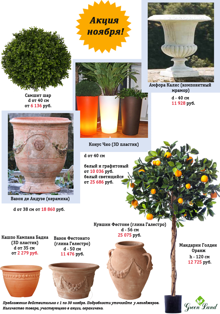Специально для тех, кто любит всё откладывать на потом, только в ноябре мы делаем скидку на подборку морозостойких моделей, которые есть в наличии на складе. Так вы уже завтра можете забрать понравившийся вазон или кашпо и наслаждаться его красотой все новогодние праздники и после них!