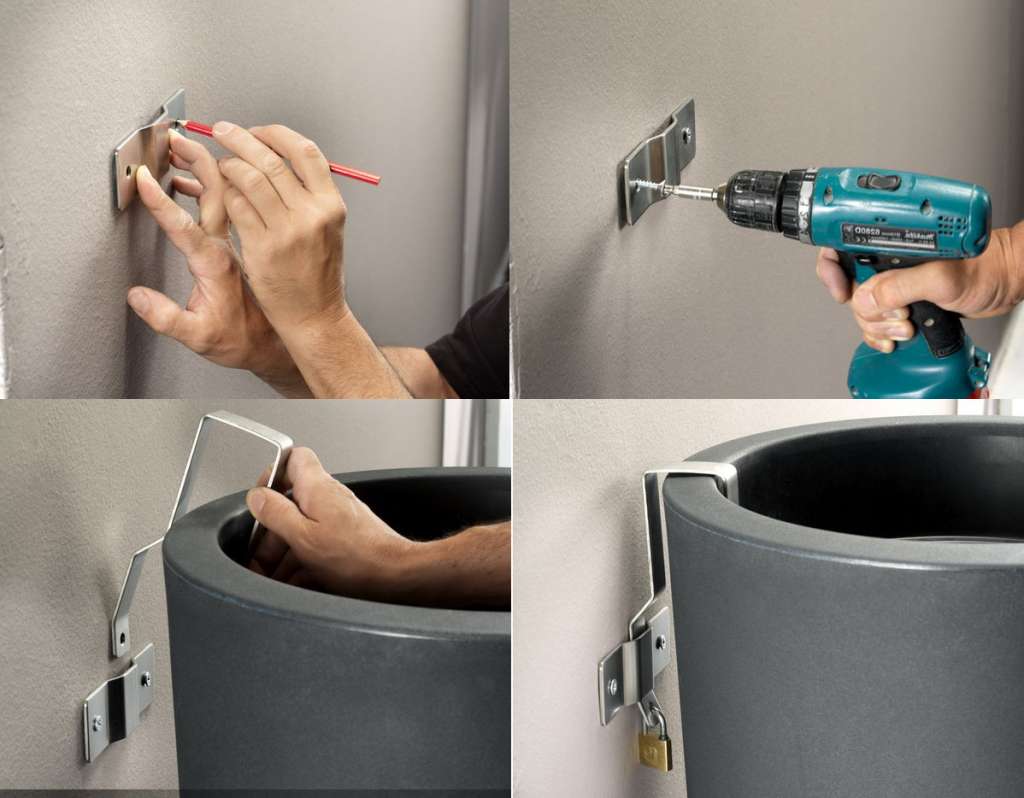 Пластиковые кашпо, модели из 3D-пластика и в общем-то из любого материала, который можно просверлить, нередко продырявливают и крепят к фасаду или асфальту при помощи длинных дюбелей или цепей. Это суровый, но порой единственно возможный вариант. Конечно, фактически кашпо испорчено, но за счёт этого и спасено. А сами крепления в жизни простым обывателям, а не зоркому глазу наших сотрудников, не так уж и заметны.